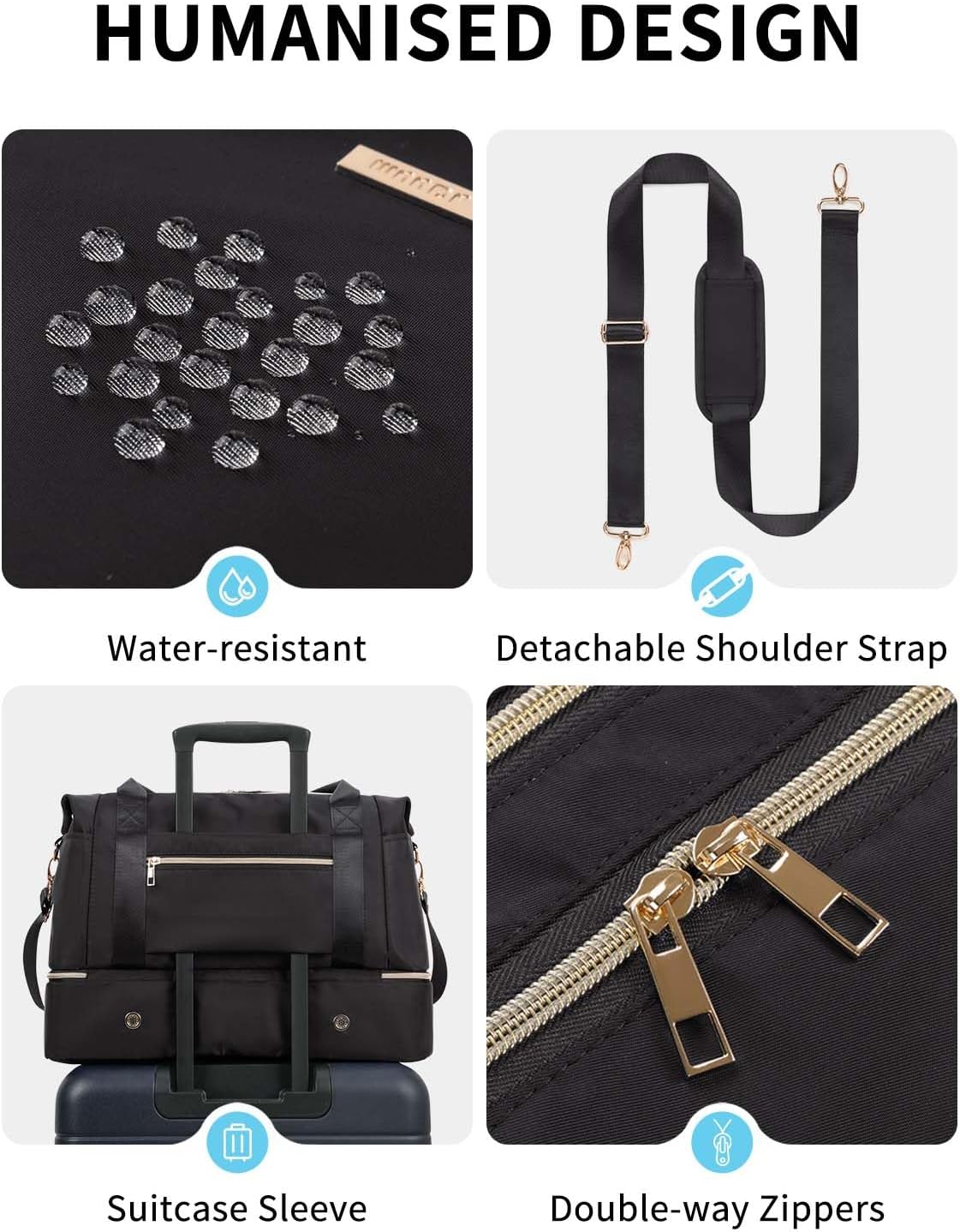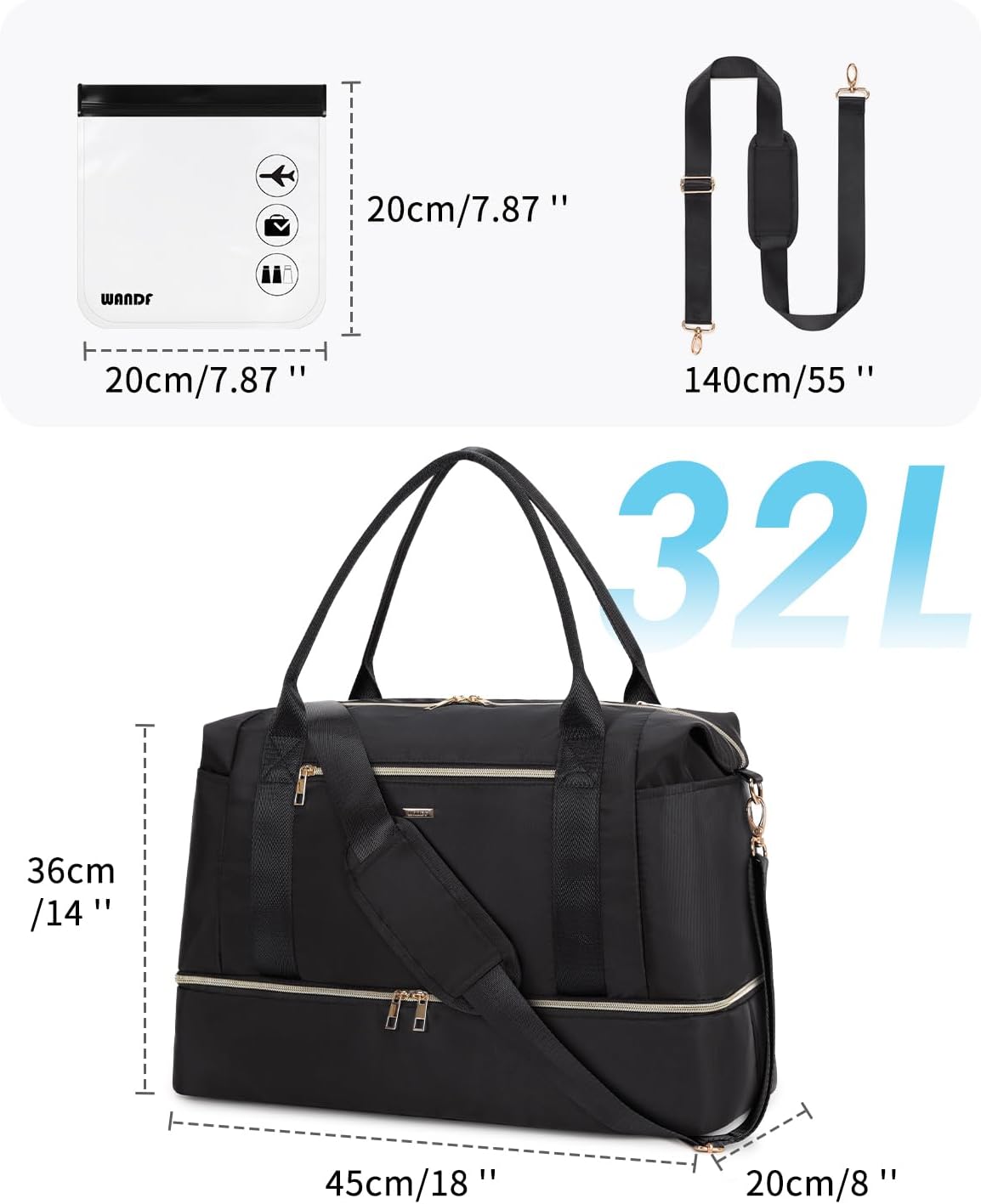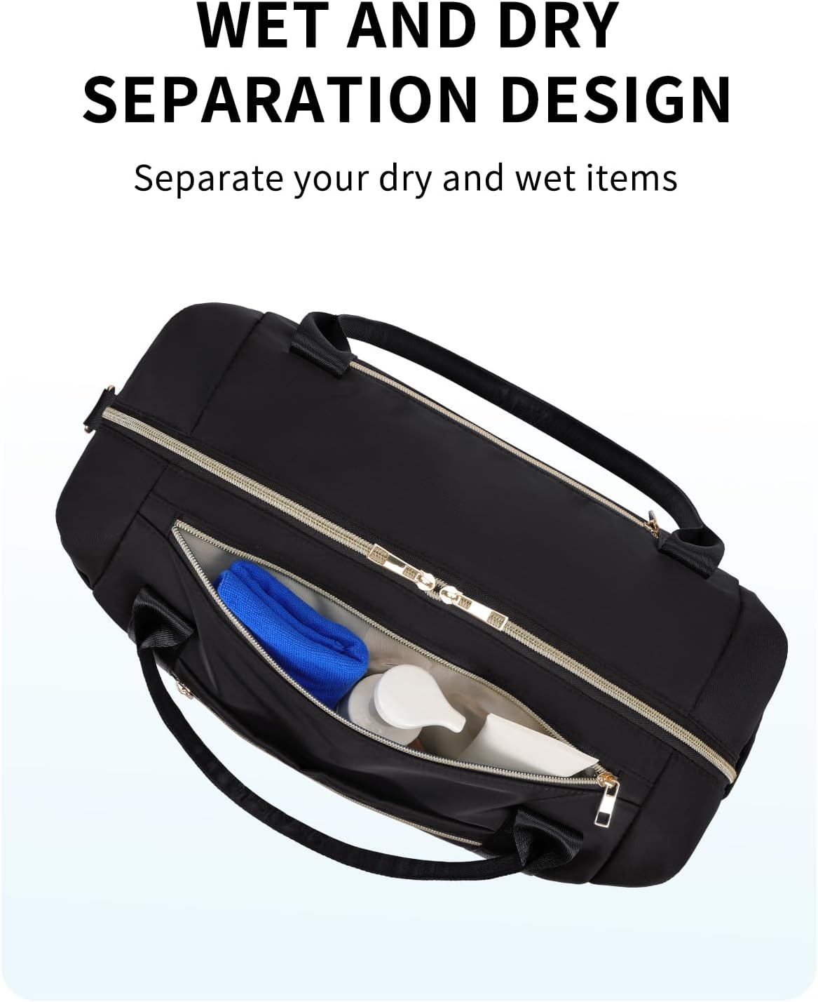 This innovative bag features a convenient wet pocket, perfect for storing damp or dirty items separately from your clean belongings. The built-in shoe compartment allows you to keep your shoes organized and separate from your other items, ensuring everything stays neat and tidy throughout your journey.