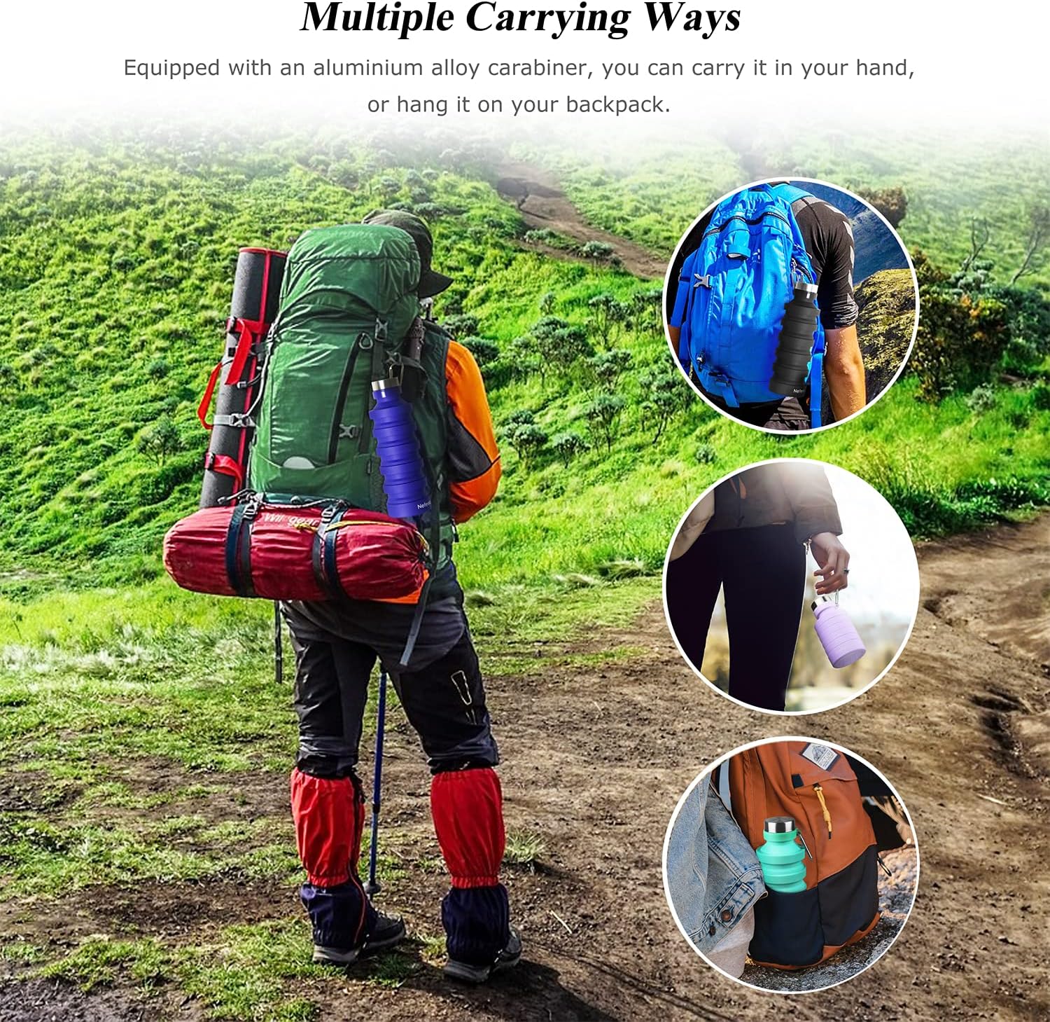 Nefeeko Collapsible Water Bottle, Reuseable BPA Free Silicone Foldable Water Bottles for Travel Gym Camping Hiking, Portable Leak Proof Sports Water Bottle with Carabiner